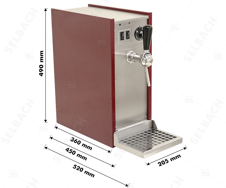 Heißgetränkegerät im Edelstahlgehäuse (SK 269-012). Seitenwände in weinrot. Mit einer Getränkeleitung und einem montierten beheizten Kugelzapfhahn. Inklusive einhängbarer Tropfschale. Leitungen und Anschlüsse befinden sich an der Rückseite. Dieses Gerät empfiehlt sich ausgezeichnet für kleinere Events oder als Beistellgerät neben bereits vorhandenen OTHG, für „Zusatzprodukte“, die keinen hohen Durchlauf haben.