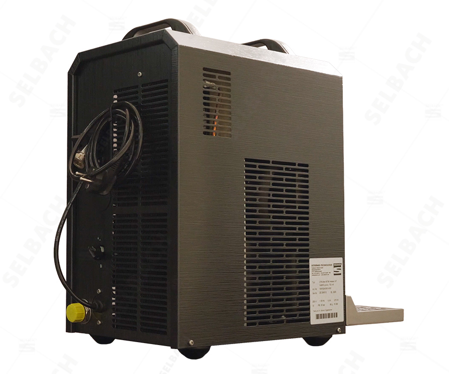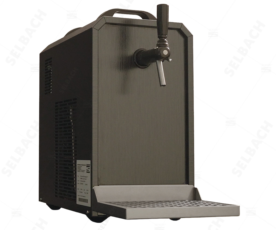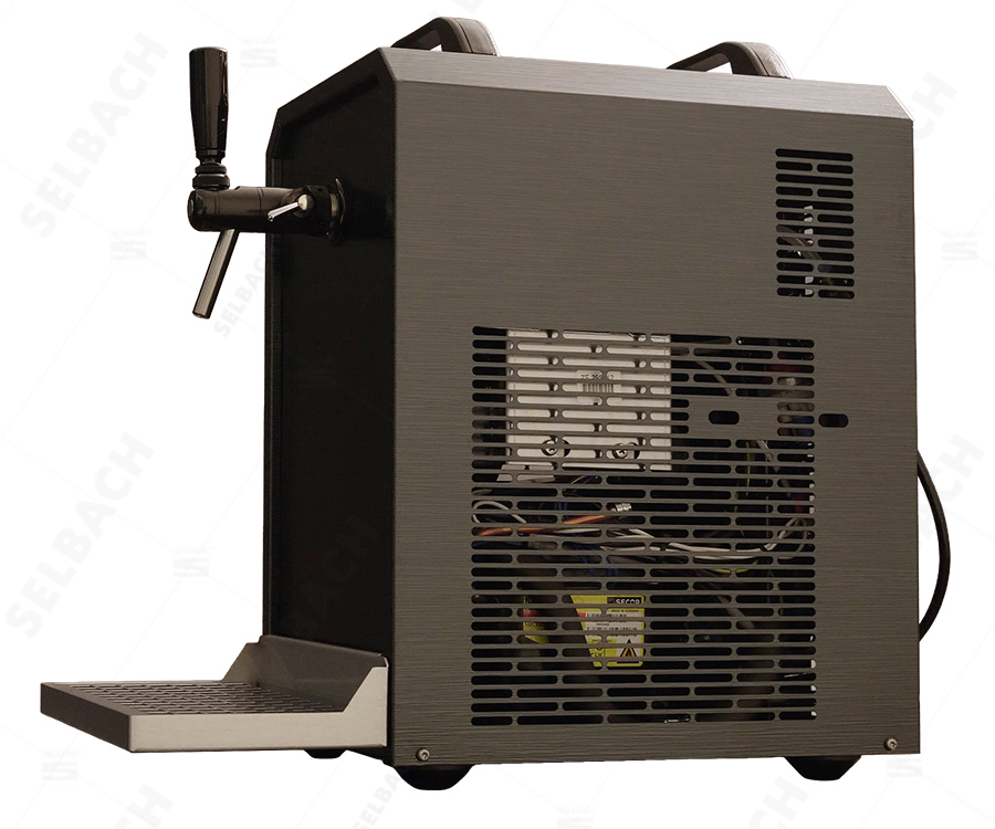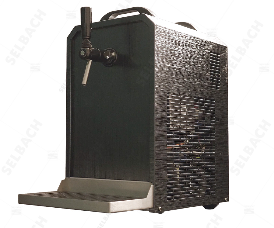 Schwarz gefärbter Edelstahl (Design Rinde), 1-leitig, mit Junior-Kompensatorhahn (Edelstahl anthrazit matt, 55 mm Stutzen, SK 275-003) und einhängbarer Tropfschale. Ausgestattet mit innenliegender Kolbenpumpe und manuellem Thermostat. Mobil und praktisch für Veranstaltungen und Partys. Stabile Tragegriffe oben erleichtern den Transport.